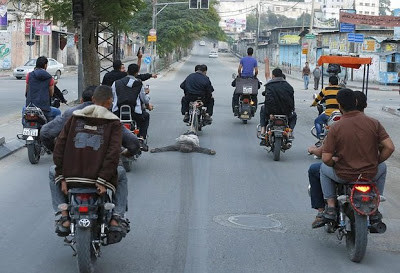 O Hamas eliminou seis 'colaboradores sionistas' e arrastou um dos corpos pelas principais ruas da cidade de Gaza.Aguarda-se a todo o momento que um grupo de ativistas da causa palestiniana (desses que fazem manifestações) denuncie o tratamento infligido a este palestiniano.